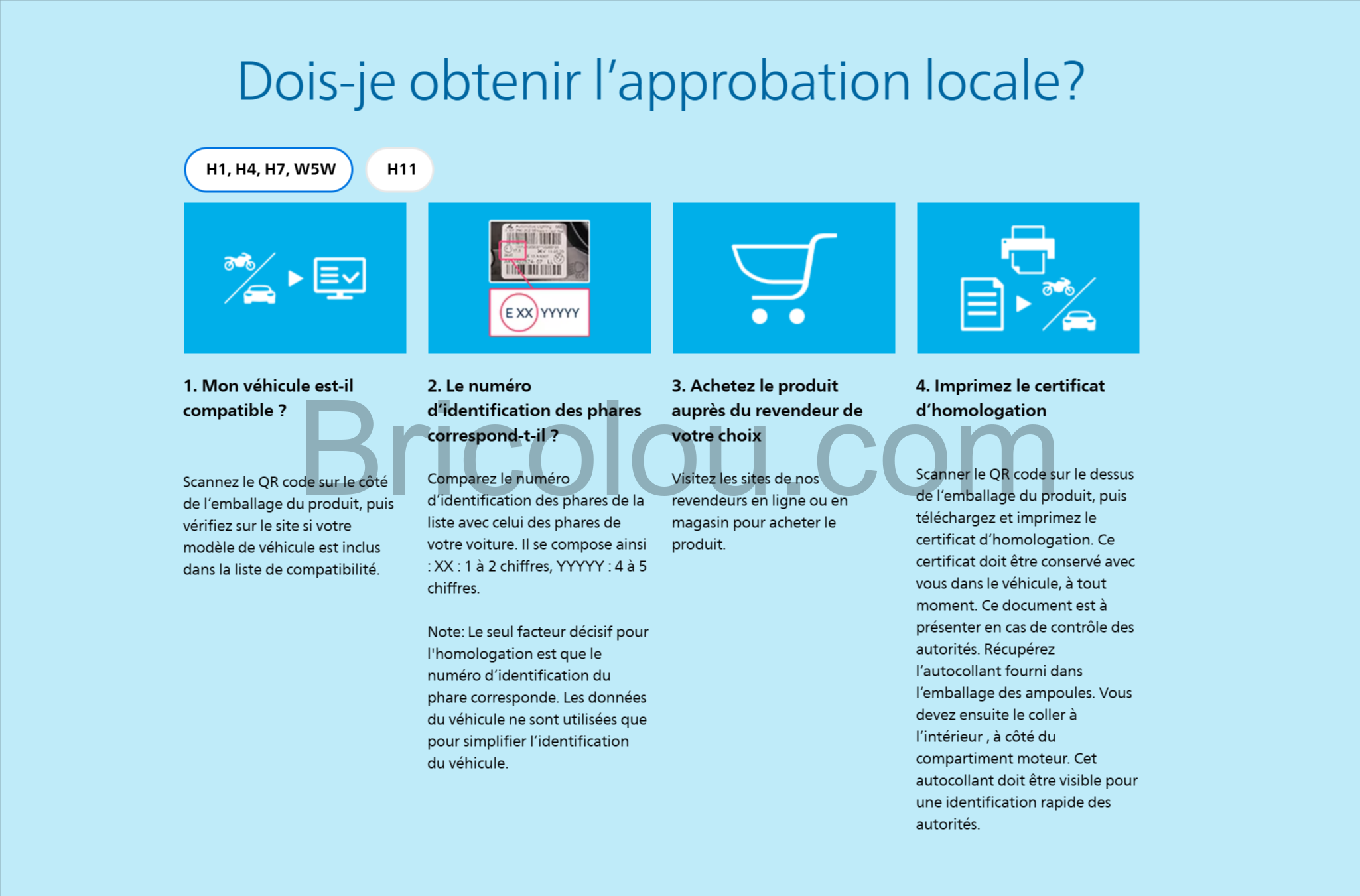 L’homologation est visible sur le site de Phillips. Il y a 3 modèles possibles pour le remplacement en H4, ici, c’est la dernière génération en version 2 que je conseille.